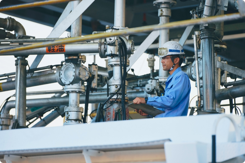 八戸、清水、小倉の各油槽所、新潟事業所では、港に接岸した船舶へ軽油や重油を出荷する業務も行っています。出荷は油槽所の設備を使って行っており、100~300キロリットル規模のさまざまな船舶が受け取りに訪れます。海上輸送の一端を担う重要な業務のひとつです。